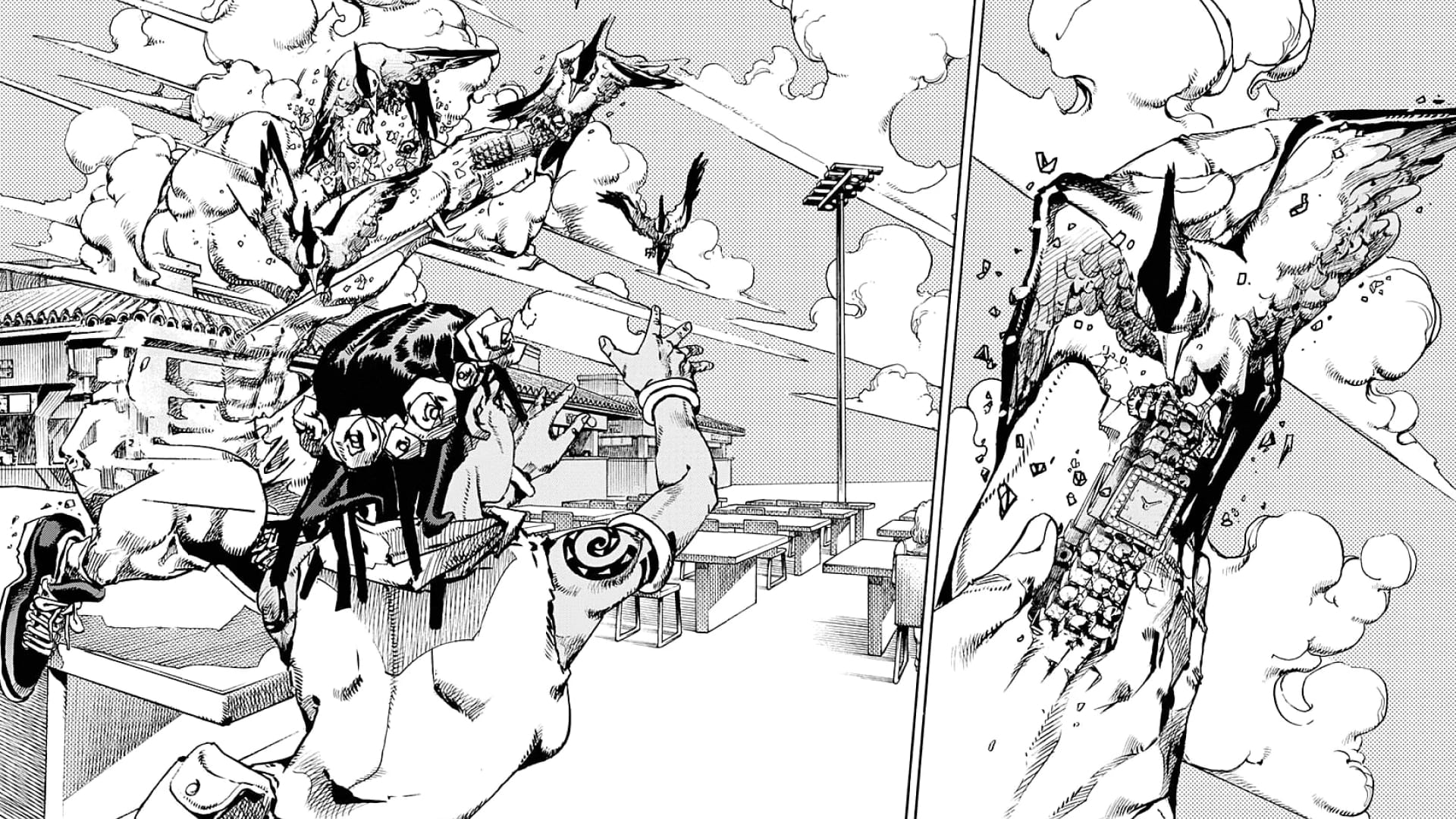 Mais au-delà des pouvoirs, c'est visuellement qu'Araki nous rappelle pourquoi il est une légende. À plus de 60 ans, le mangaka semble avoir atteint une forme de sérénité graphique où la complexité devient limpide. Il s'amuse à dessiner des situations d'une densité folle avec une simplicité incroyable. Les scènes d'action bénéficient d'une fluidité exemplaire, portées par des plans originaux que l'on ne retrouve nulle part ailleurs. Chaque trait semble posé avec une assurance absolue, rendant le chaos créatif parfaitement lisible.